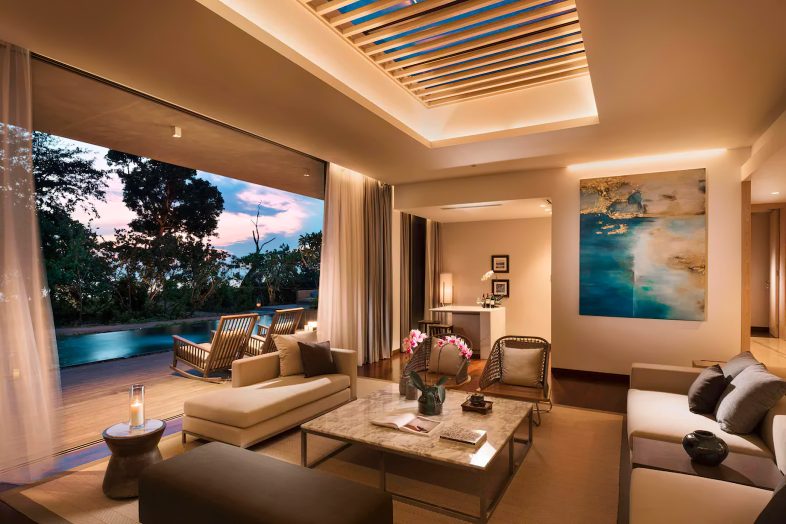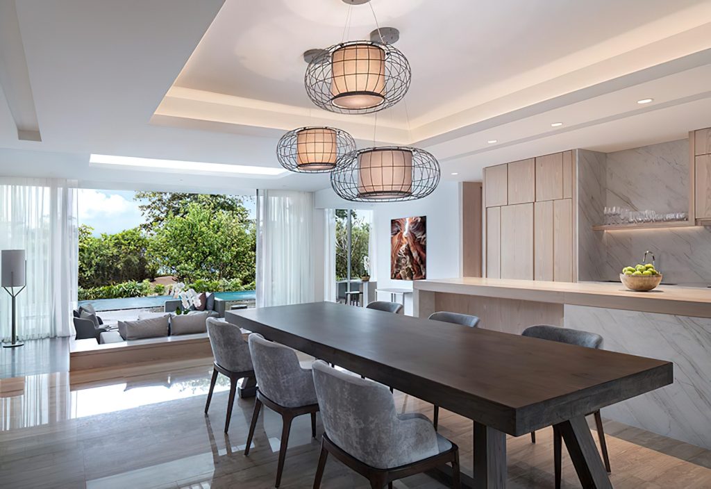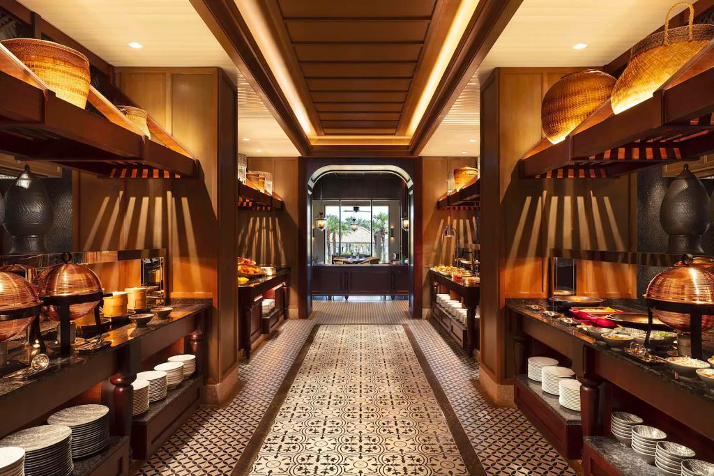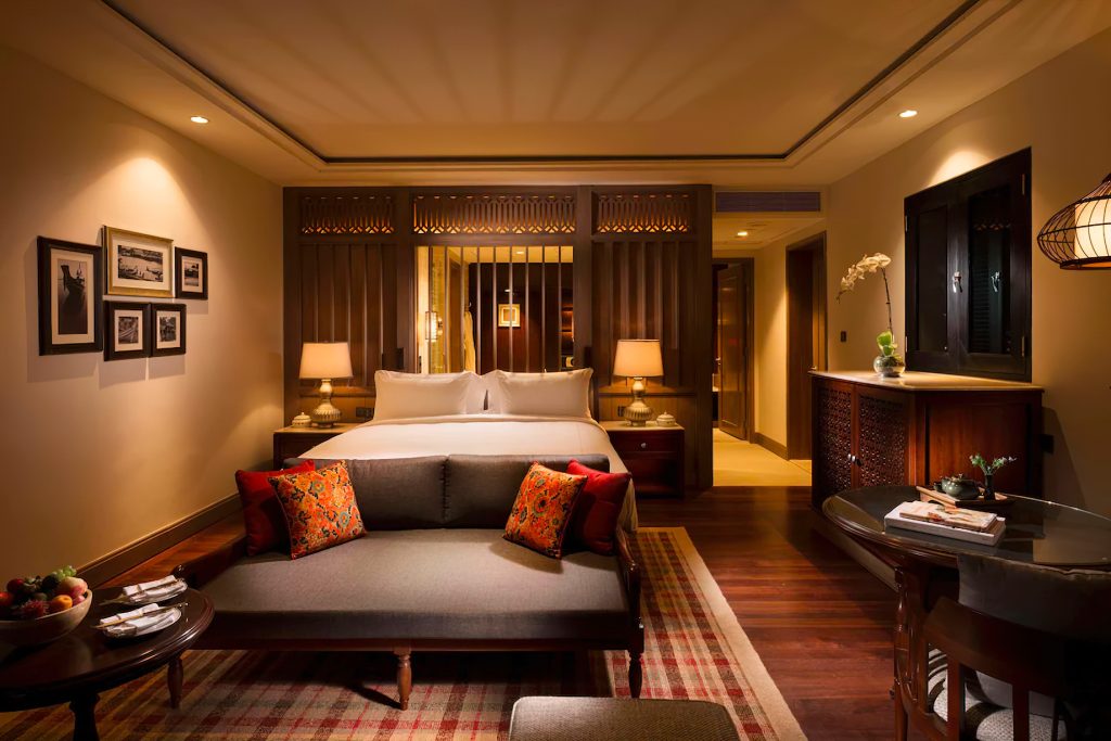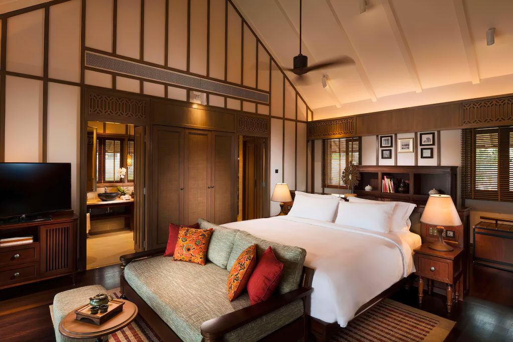Guests can select from 111 rooms, villas, each offering stunning views from wraparound balconies. Choose a Malaysian-style villa for a serene escape or indulge in a beachfront residence with a private pool for the ultimate coastal getaway. The resort’s accommodations are tastefully decorated with deluxe rooms housed in low-rise traditional Malay buildings that overlook the gardens, lagoon, and ocean. Thirteen luxurious stand-alone double-story one and two-bedroom pool villas are located around a lagoon, featuring a design inspired by traditional kampong houses that are constructed to suit Malaysia’s tropical climate. Floor-to-ceiling windows slanted carved wooden panels, louvres, and vents under the roof, and wide-open doors allow natural airflow to cool the interior, creating a comfortable and authentic experience.