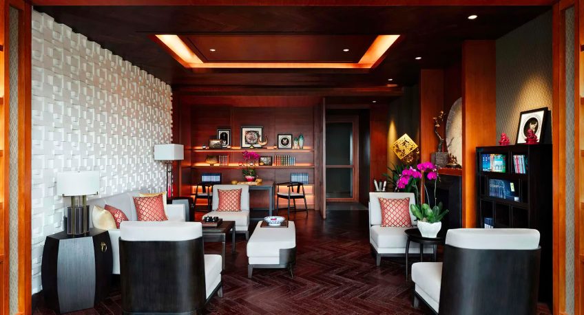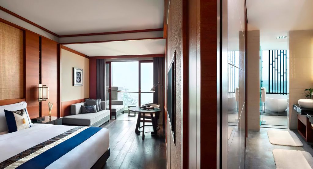 The 218 rooms, suites, and pool villas at the Anantara Guiyang offer luxurious amenities and modern comforts, with warm and understated elegance. The private balconies offer views of the gardens, fairways, or mountains, and the rooms are decorated with oriental design accents and traditional Chinese tea sets. The suites also feature a living room and a balcony or garden terrace with seating. The one-bedroom pool villas are impressively designed with a plunge pool, two sundecks, dining furniture, and a king bedroom, living and dining room, pantry, and cloakroom. The three-bedroom pool villas offer even more luxury, with a private pool, four sundecks, indoor and outdoor lounging, and dining spaces, three en-suite bedrooms, a gym, massage room, and pantry spread over two stories. These connecting rooms, suites, and villas provide the perfect space for families, friends, and groups to spend quality time together. The bathrooms have a rain shower and an oversized bathtub.
