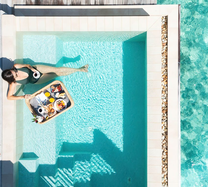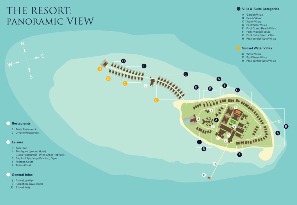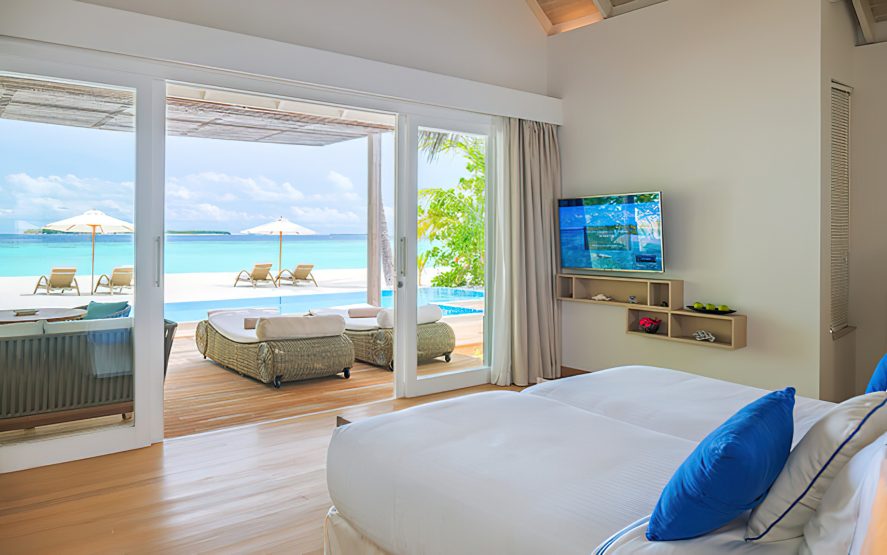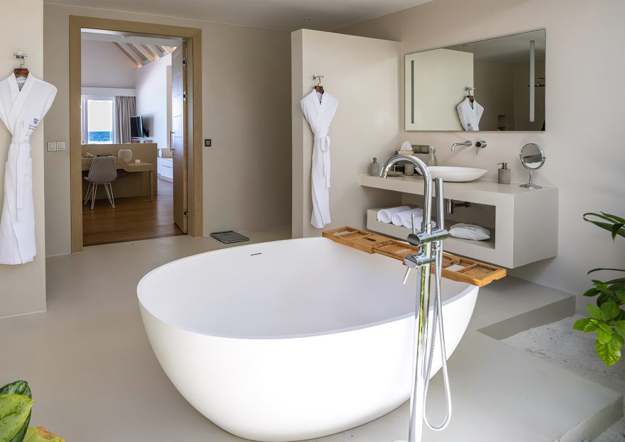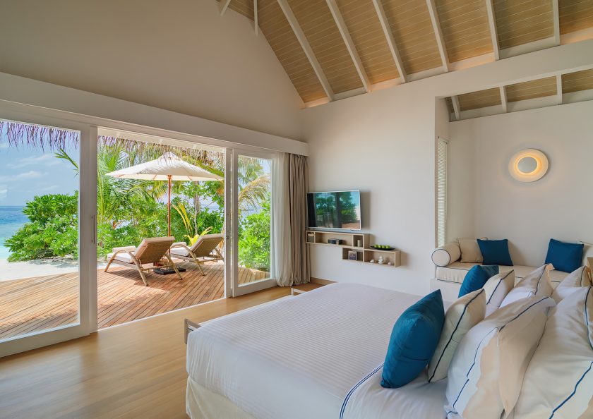 The resort offers 96 prestigious villas surrounded by turquoise water, velvet white sand and tropical nature with 33 Water Villas, 9 Pool Water Villas, 31 Beach Villas, 6 Pool Suite Beach Villas, 5 Pool Grand Beach Villas, 3 Two-bedroom Family Beach Villas, 8 Garden Villas and a stunning Three-bedroom Presidential Water Villa directly on the clear waters of the Indian Ocean. Designed down to the smallest detail with Italian elegance and sophistication to ensure a perfect combination of aesthetics, functionality, and respect for the environment. The villas interiors are finished in subtle color schemes, with accents of sharp green and blue, and furniture that would fit right in a villa on the Amalfi Coast.
