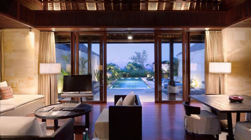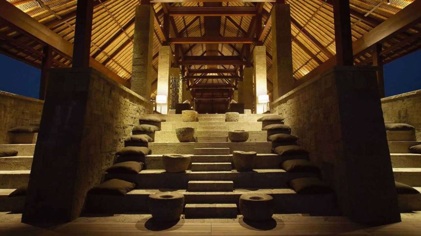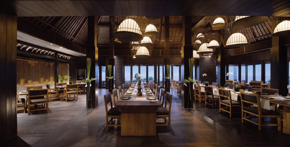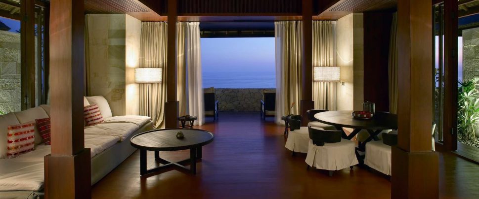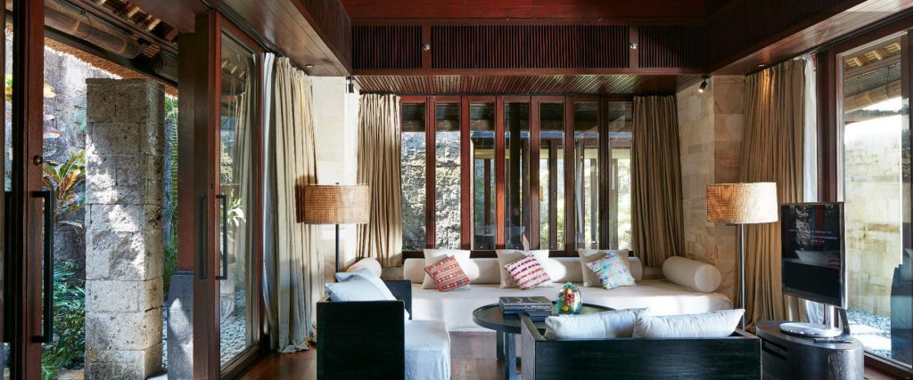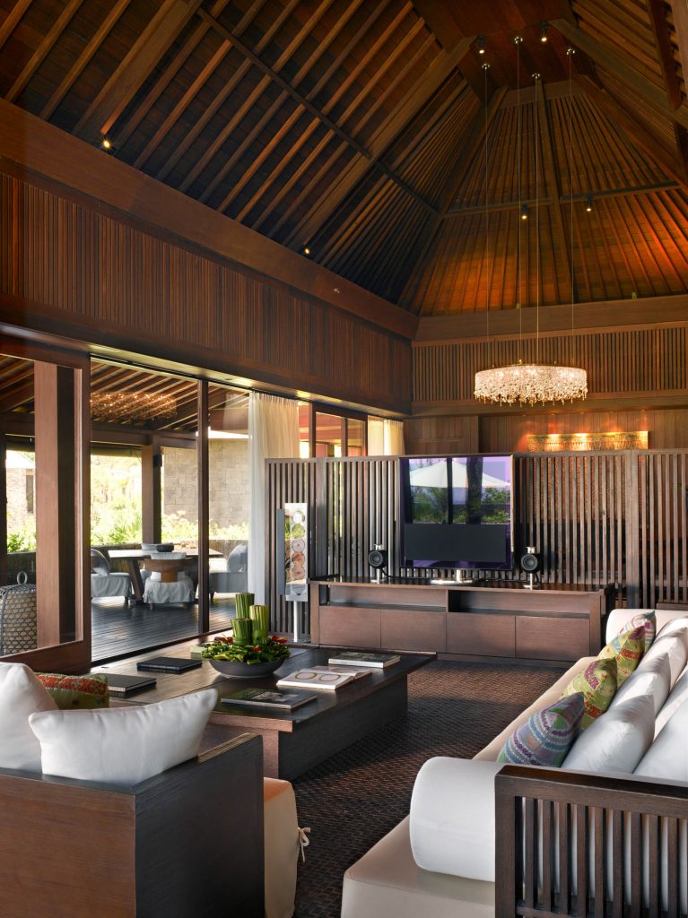 Designed by architects Antonio Citterio Patricia Viel and Partners, the resort’s layout and overall design incorporates the culture and natural elements of the location. The hotel has been built and furnished using hand-cut volcanic stones, rich exotic woods and refined fabrics. Natural lava and palimanan stone are used for the garden and interior walls, refined bangkiray hardwood in the villas, natural green-colored sukabumi stone to clad outdoor showers, plunge and swimming pools. A collection of exquisite Balinese antiques and exotic art pieces adorn the entire resort. Furniture and decorative details, such as stemware, flatware, ceramics and woven fabrics, were designed and produced in Bali by a team of local artists and designers in collaboration with the resort’s architects.