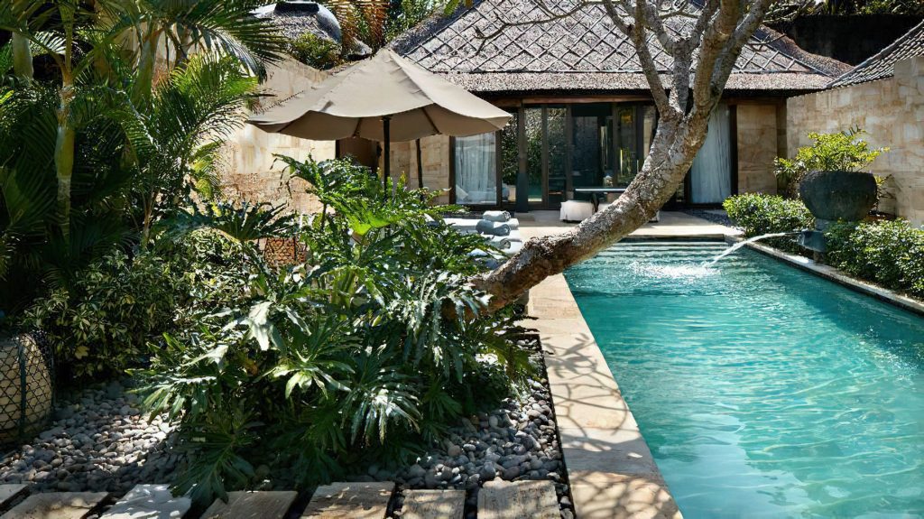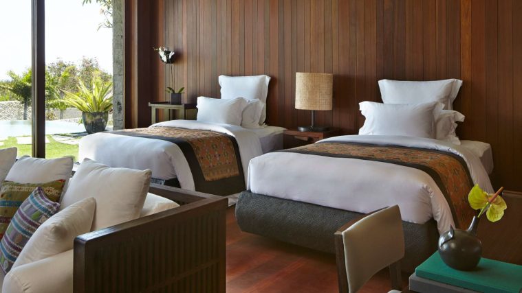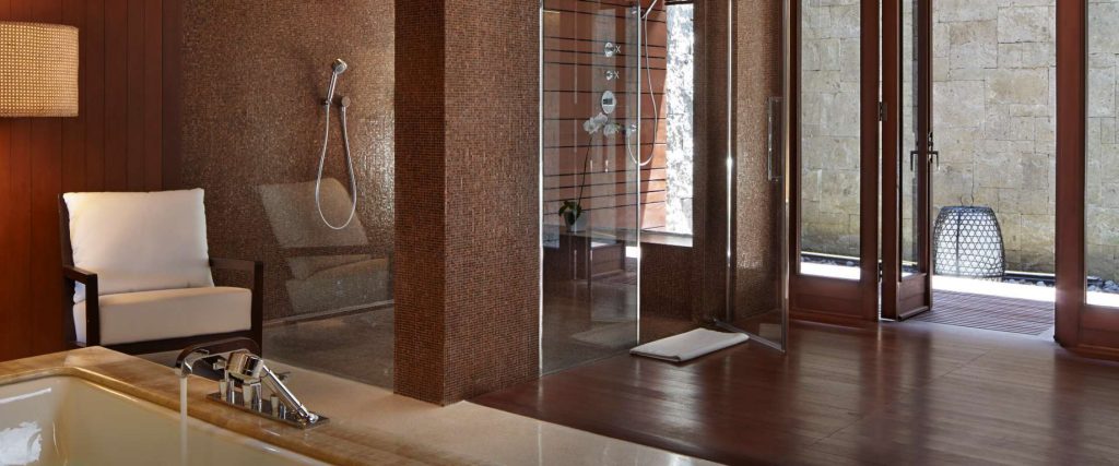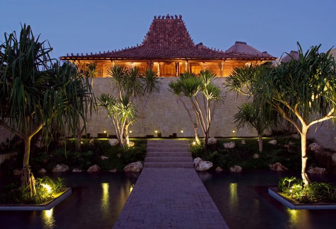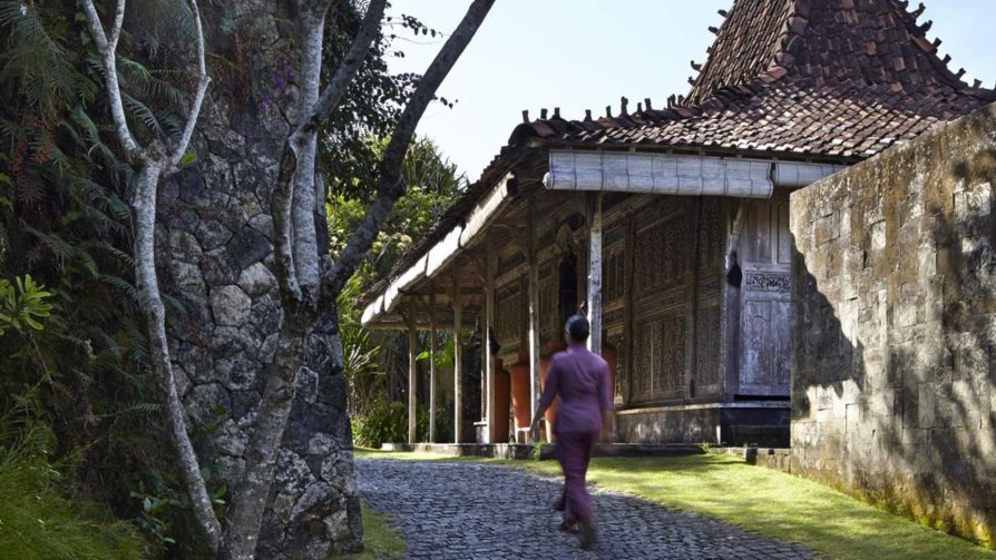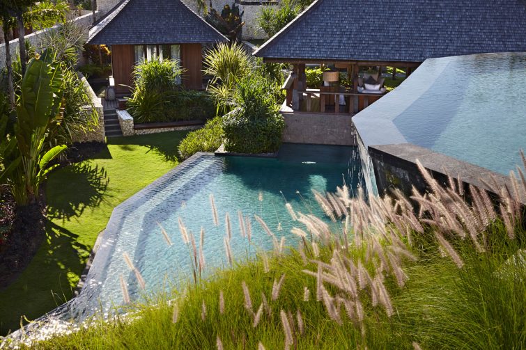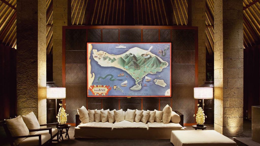 Designed by architects Antonio Citterio Patricia Viel and Partners, the resort’s layout and overall design incorporates the culture and natural elements of the location. The hotel has been built and furnished using hand-cut volcanic stones, rich exotic woods and refined fabrics. Natural lava and palimanan stone are used for the garden and interior walls, refined bangkiray hardwood in the villas, natural green-colored sukabumi stone to clad outdoor showers, plunge and swimming pools. A collection of exquisite Balinese antiques and exotic art pieces adorn the entire resort. Furniture and decorative details, such as stemware, flatware, ceramics and woven fabrics, were designed and produced in Bali by a team of local artists and designers in collaboration with the resort’s architects.