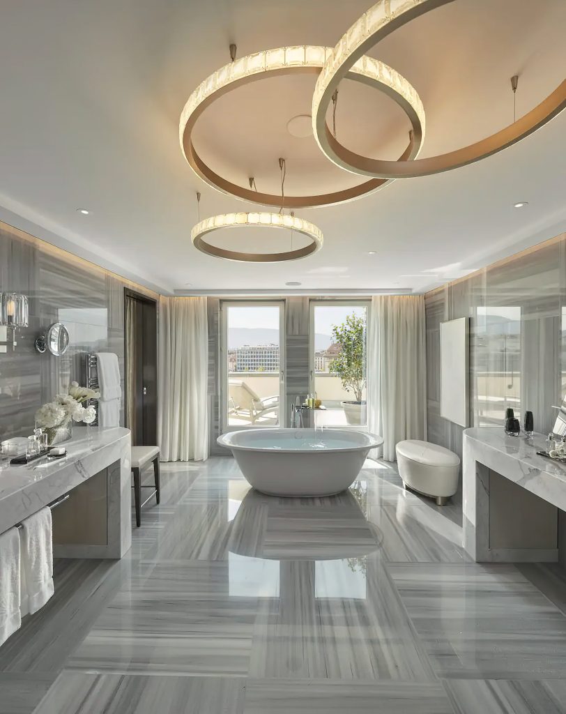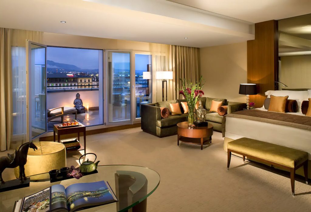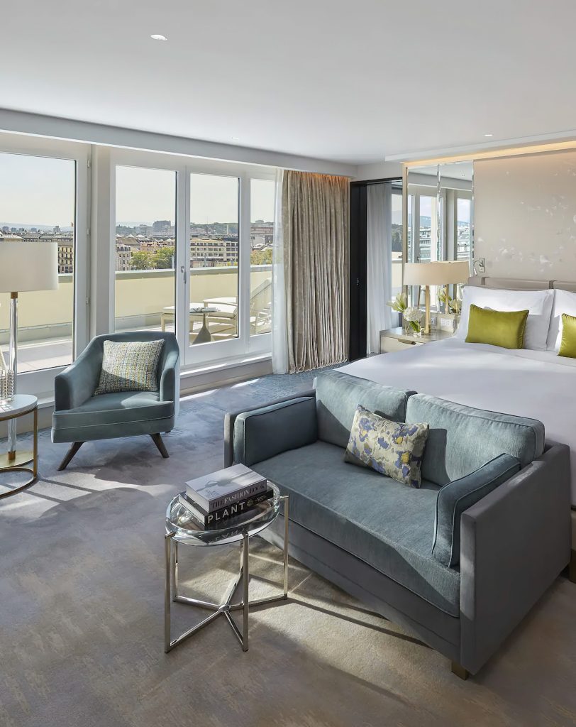 The hotel features 178 elegant and spacious guest rooms and suites with stunning river or serene garden views. The elegantly designed rooms and suites combine soothing earth tones, calculated symmetry with clean curves and modern furniture luxuriously providing some of the most beautiful accommodations in Geneva. Offering a spectacular level of luxury, the Royal Suite can be joined with the adjacent Mandarin Room to form a three-bedroom living space. Accessible via private elevator, and ideal for entertaining, The Royal suite features dining for up to six guests, with scenic views of the river, city, and mountains. The Royal Penthouse provides 325- square meters of contemporary design and elegance. Located on our seventh and highest floor, the three-bedroom suite features a 175-square meter panoramic terrace overlooking the Rhône River, Old Town, and the snow-capped mountains.