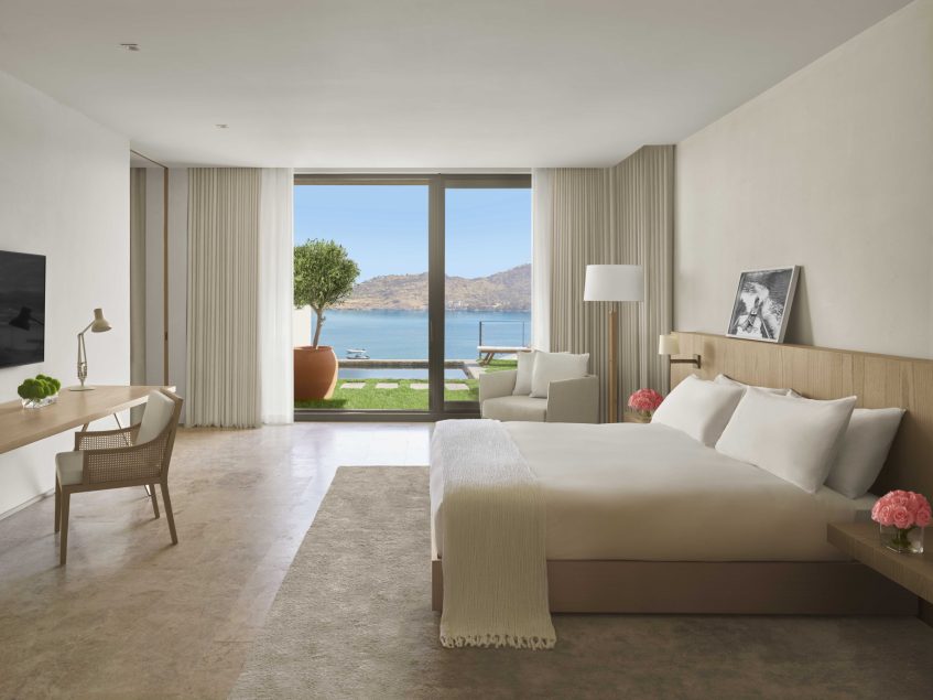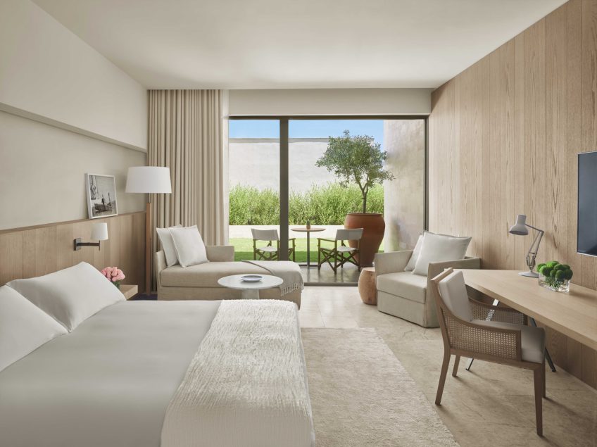 The hotel features 108 guest rooms, suites, and villas with custom designed furnishings, indulgent marble bathrooms, stone floors and oversized windows magically framing the iconic garden and breathtaking views of the Aegean Sea. The spacious airy spaces invite utter relaxation. For those seeking a truly exclusive luxury refuge, the exceptional four-bedroom private villa offers complete privacy, with its own swimming pool and sauna area.