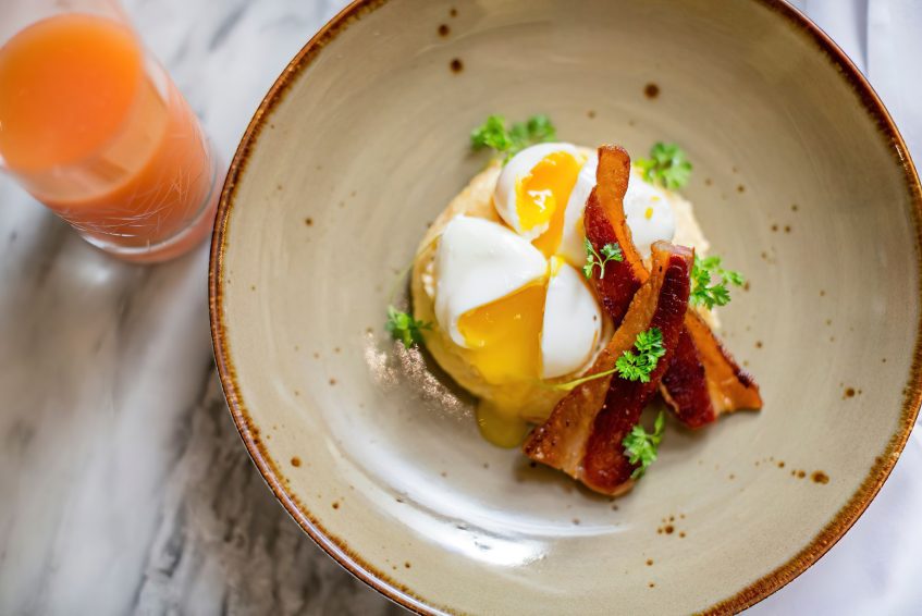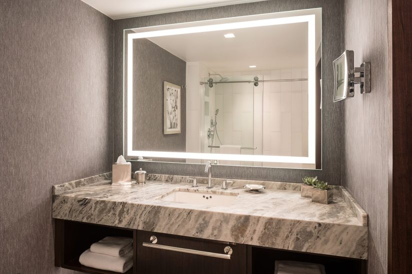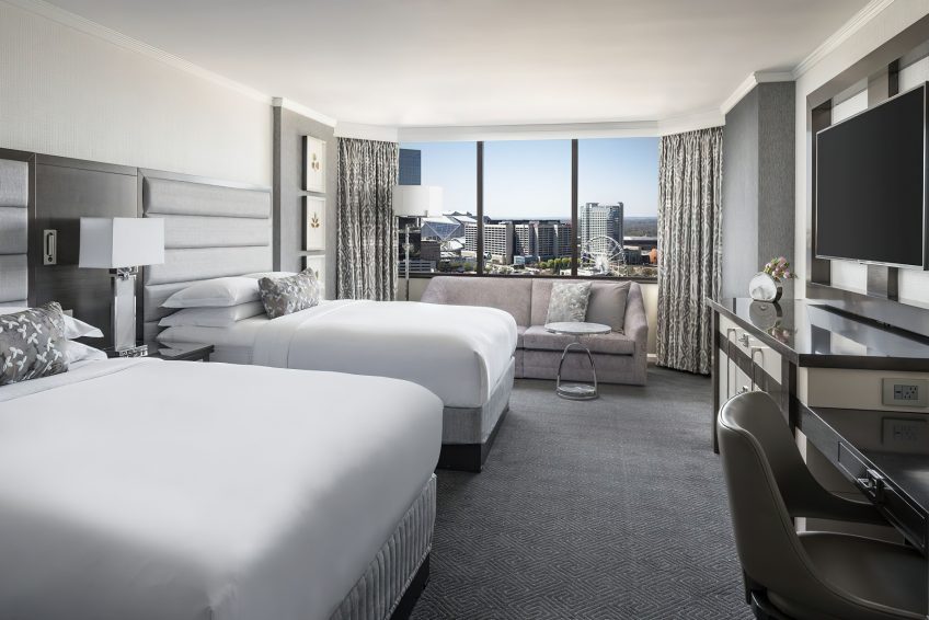 The hotels 444 elevated guestrooms and suites overlook the Atlanta skyline with a feel that evokes custom high-rise living at a downtown retreat. The elegant Southern design incorporates contemporary features, including panoramic views and a design is infused with a fervent sense of place. Guestroom bathrooms are finished in calming hues of blue and lavender along with inlayed lit mirrors while King guestroom bathrooms are upgraded with a marble walk-in shower and floating vanity all set behind a rolling barn door. The living area gives way to in-room relaxation with versatile seating that appeals to both business travelers and families alike. An exclusive Club Lounge enhances any stay with signature experiences, culinary offerings, and dedicated concierge service.