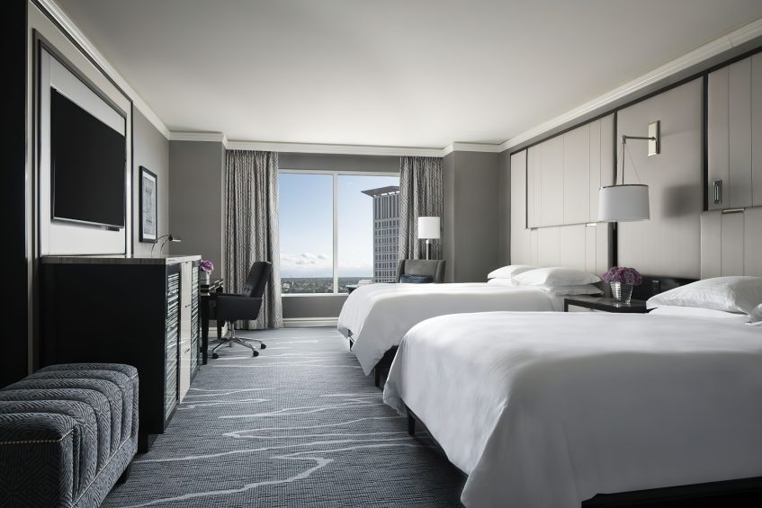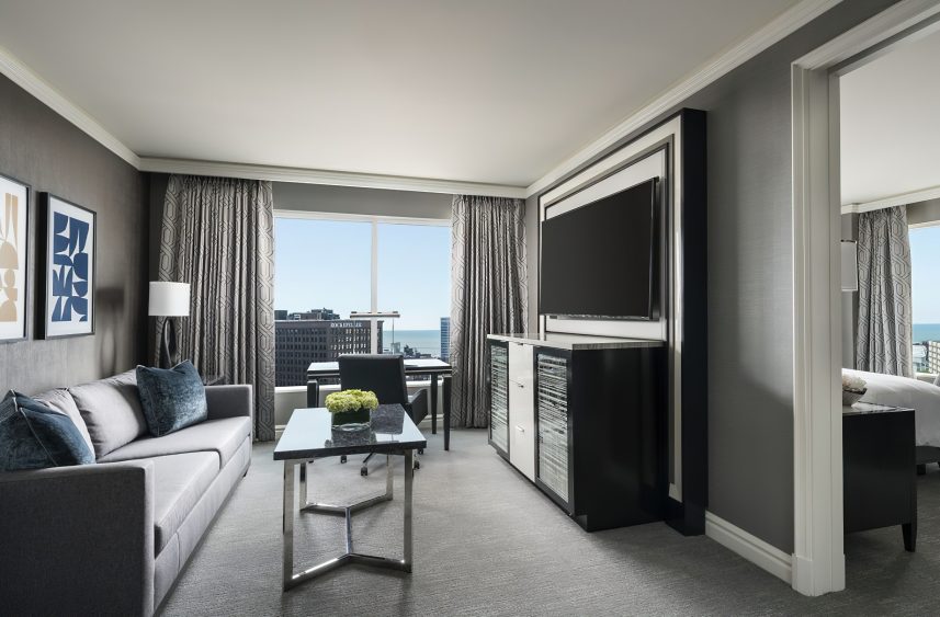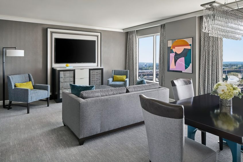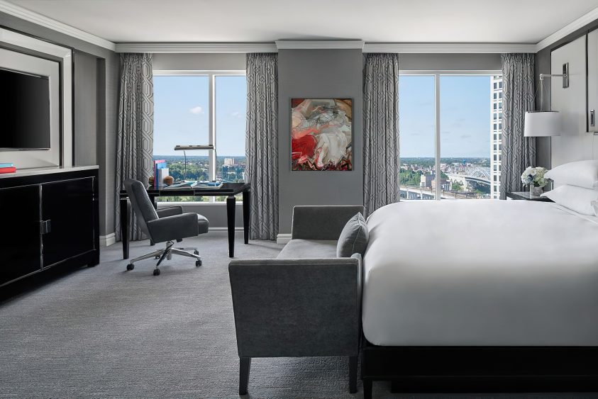 Combining a comfortable elegance with connectivity and high functionality, the hotels 206 guest rooms and suites design celebrates the city’s spirit and culture while adding contemporary elegance to an iconic Midwestern landmark. Using naturally inspired elements and patterns, the interior design is inspired by the geographic and historic features unique to the hotel’s surrounding area. The modern accommodations use décor and color to reflect the steel-working industry with today’s traveler in mind, the new guest room design offers a modern approach to luxury with a very personalized relax, work and sleep experience.