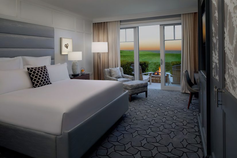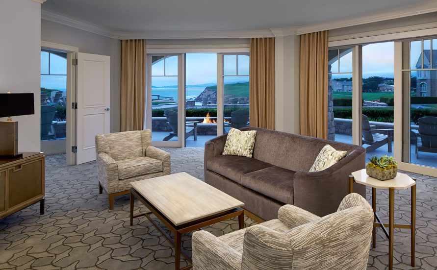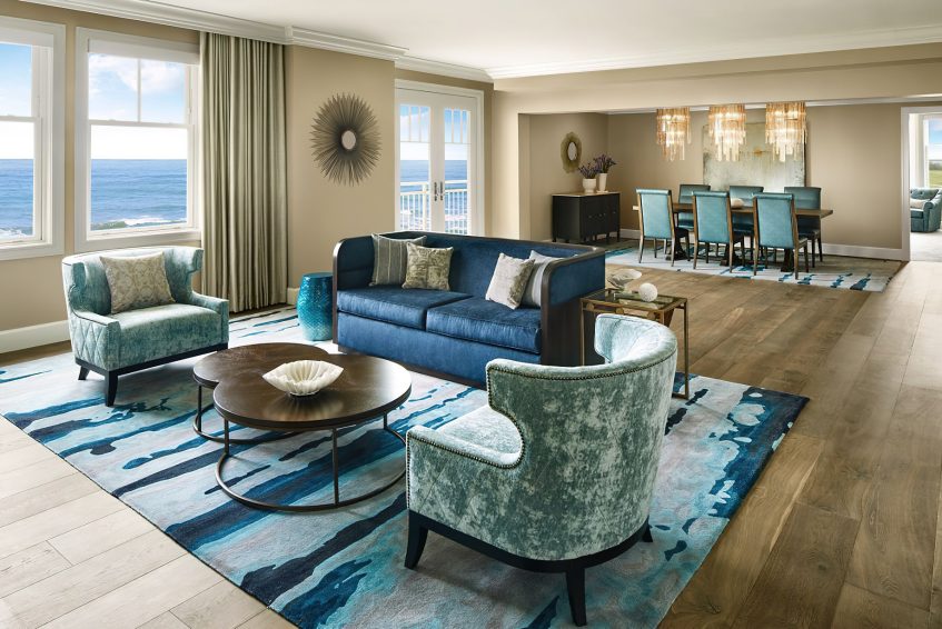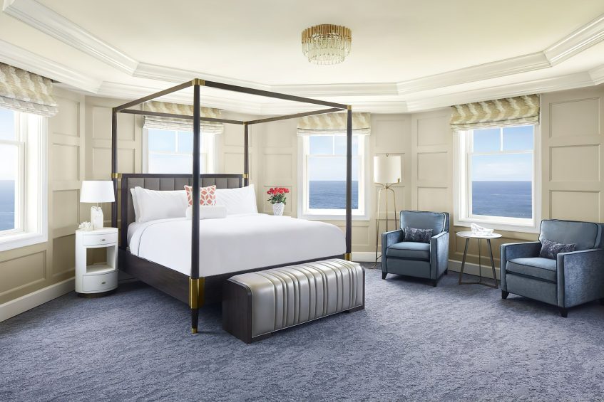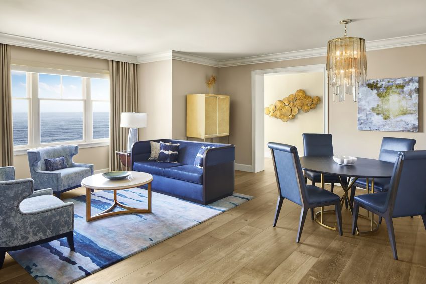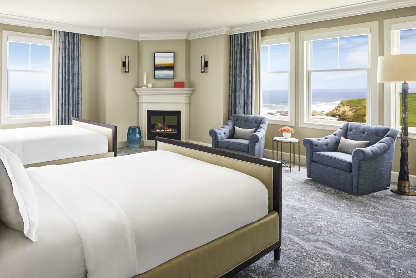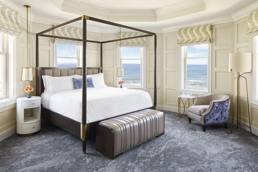 The coastal decor inspired by the surroundings evokes peace and tranquility throughout the resort. Taking cues from its seaside location and โgrand seaside lodgeโ architecture, the resorts 261 rooms and suites boast a clean, modern aesthetic. Clear days saturate the bright rooms with warm resplendent Pacific blues and golden sun rays while overcast days envelope the guest in moody Northern coast grays. Elegant textiles apply these palettes through soft textures blended with bold prints and organic patterns. While gazing out of the bedroom windows, the carpet through pattern and color becomes one with the ocean beyond creating a mesmerizing visual effect in which one seems to extend to the other. Contemporary high-end furnishings and carefully curated design touches are found throughout.