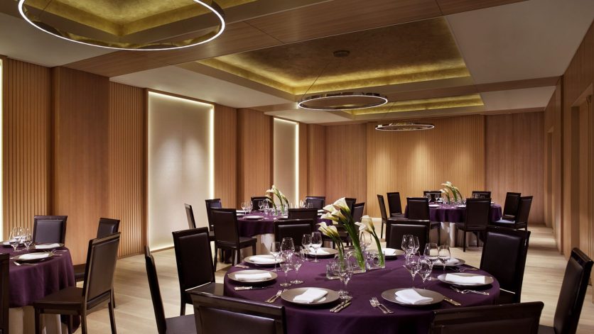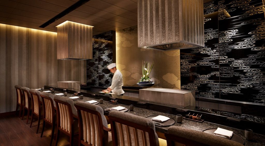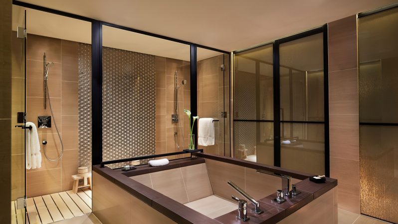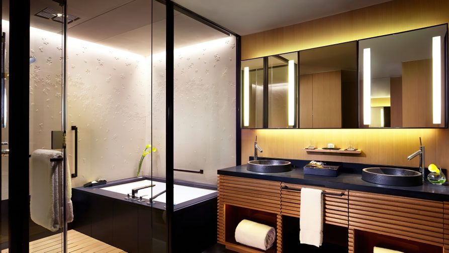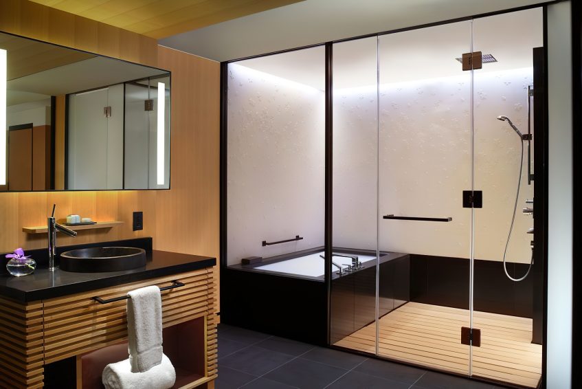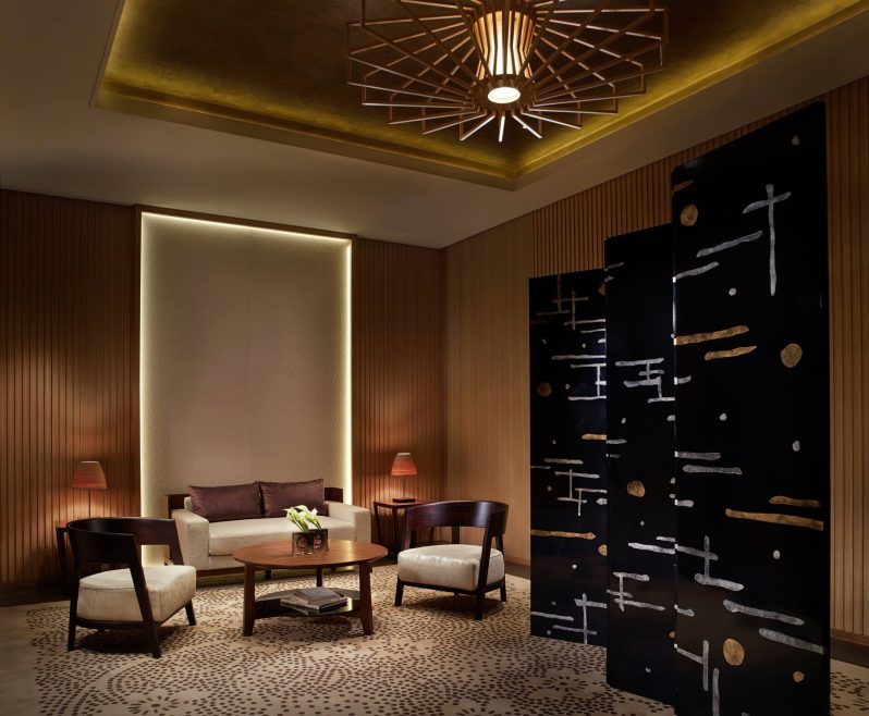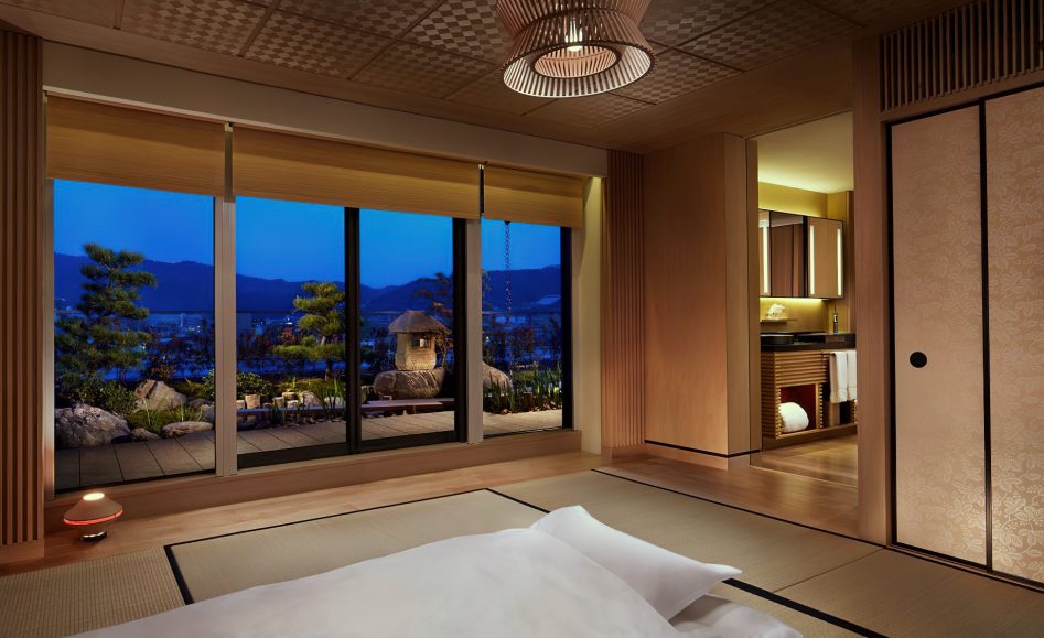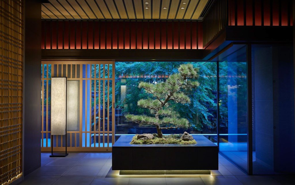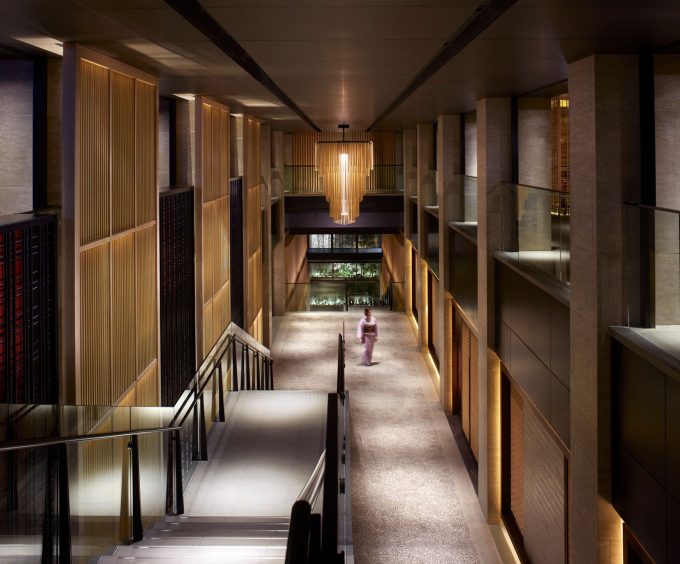 The hotel’s 134 guestrooms and suites offer full views of the river and the Higashiyama Mountains. The interiors created by Peter Remedios and Spin Studios honour the cultural design traditions of Japan, with patterned motifs created by local artisans and the incorporation of Zen rock gardens (karesansui) and water features, including a four-storey waterfall are aesthetically positioned in the heart of the hotel. The hotel’s interior spaces were each designed with concepts that pay respect to Kyoto’s history. The public spaces, banquet rooms and conference rooms were designed in accordance with the concept utage, or “feast”, the spa embodies seido, or “stillness and movement”, the lobby exudes miyabi, or “elegance”, and the guest rooms were designed with hana (“opulence”) and nagomi (“calm”) in mind.