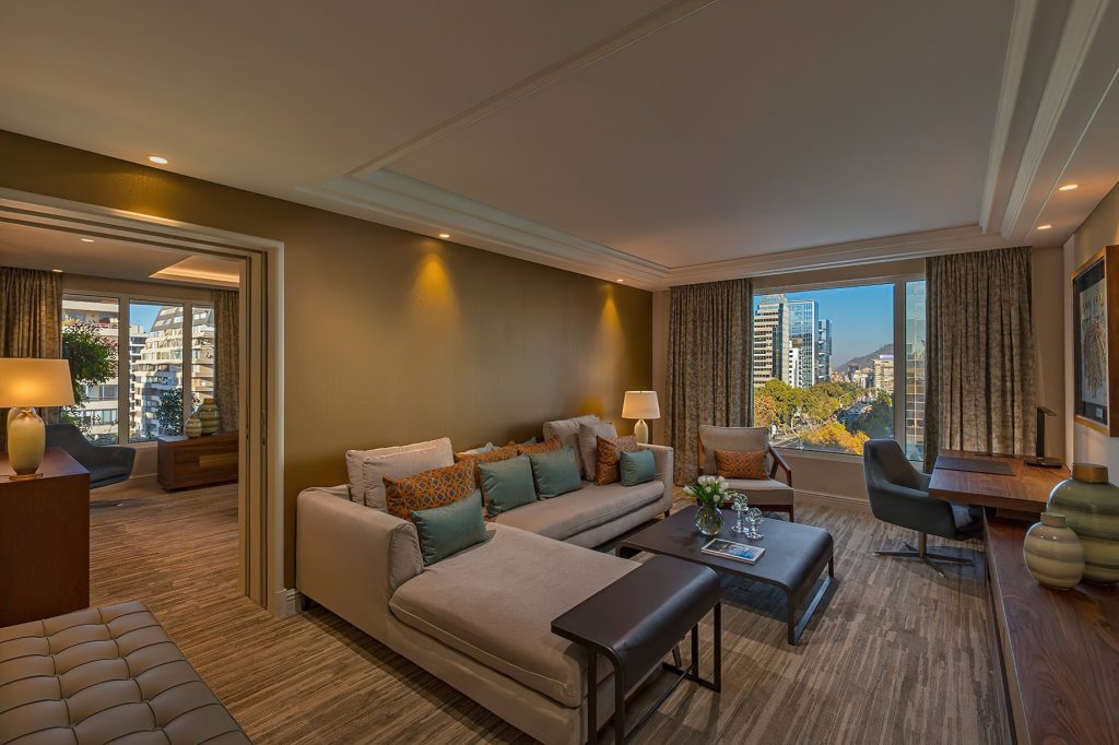 This sophisticated retreat features 205 air-conditioned accommodations including 49 Club Level rooms, 3 Club Suites, 12 Executive Suites and a Presidential Suite. The rooms are classic in design aesthetic inspired by Chileβs natural beauty, with touches of Latin America dΓ©cor, accents, artwork, and amenities appealing to modern business travelers. Beds feature Egyptian cotton sheets and premium bedding. televisions with cable channels and pay movies. Many rooms have partially open bathrooms with bathrobes, slippers, designer toiletries, and complimentary toiletries.