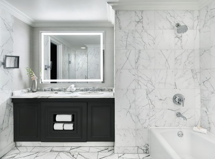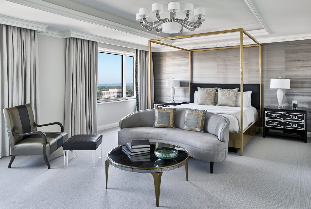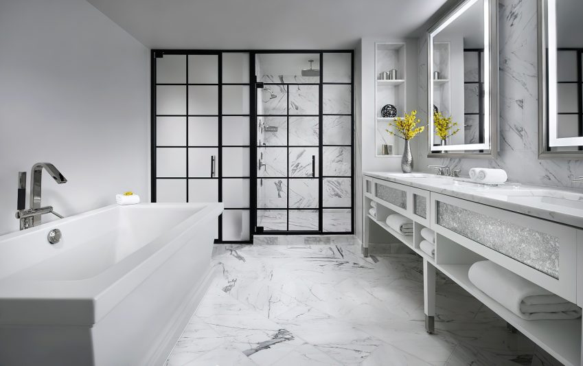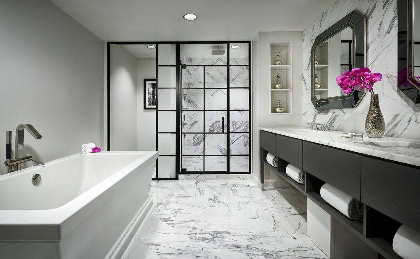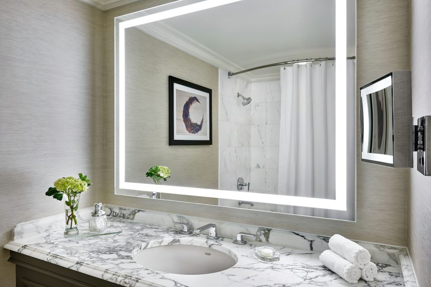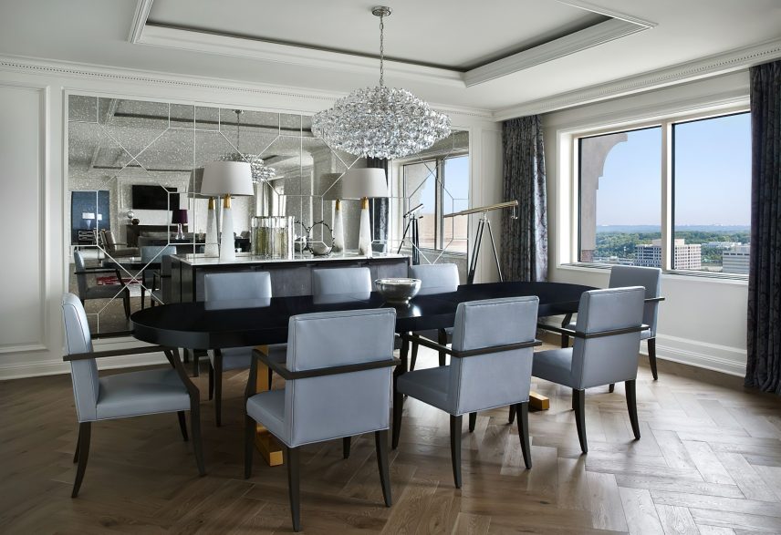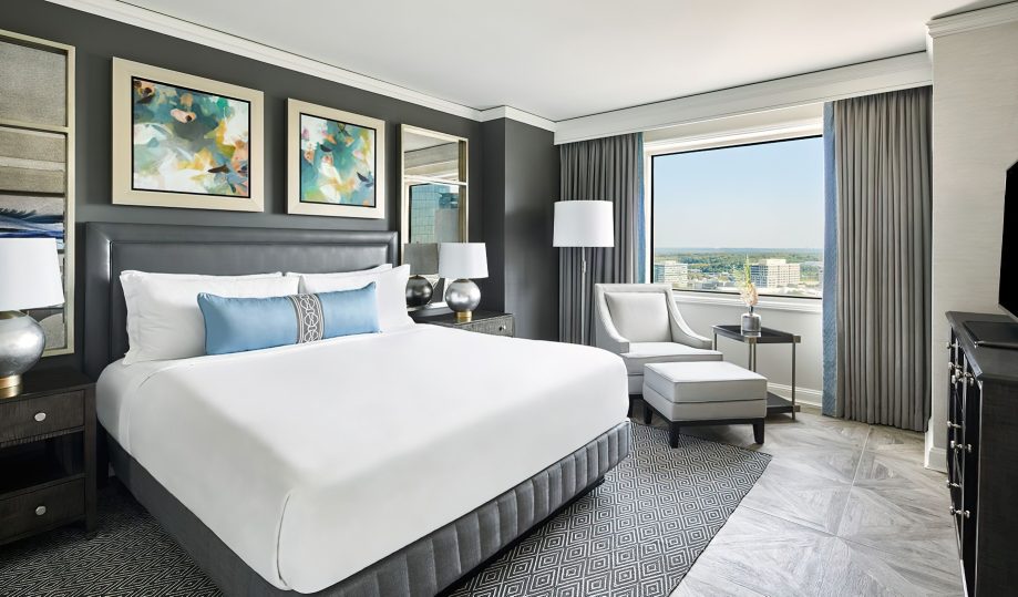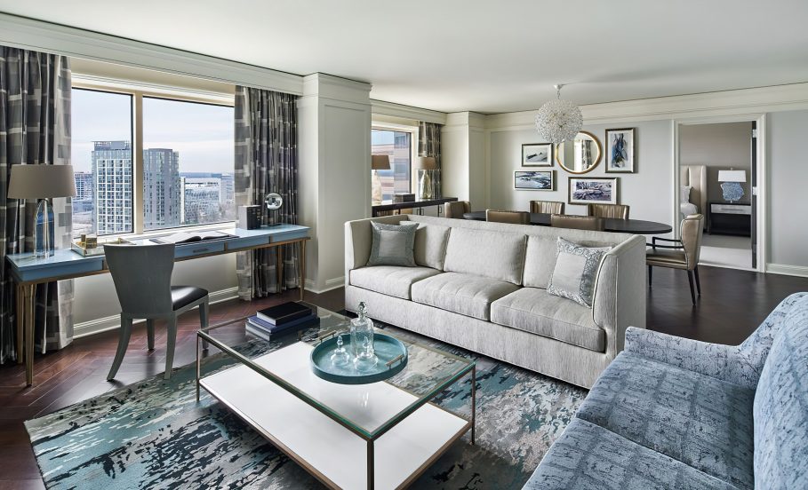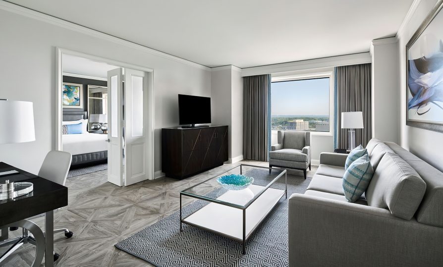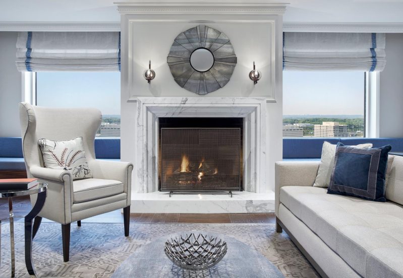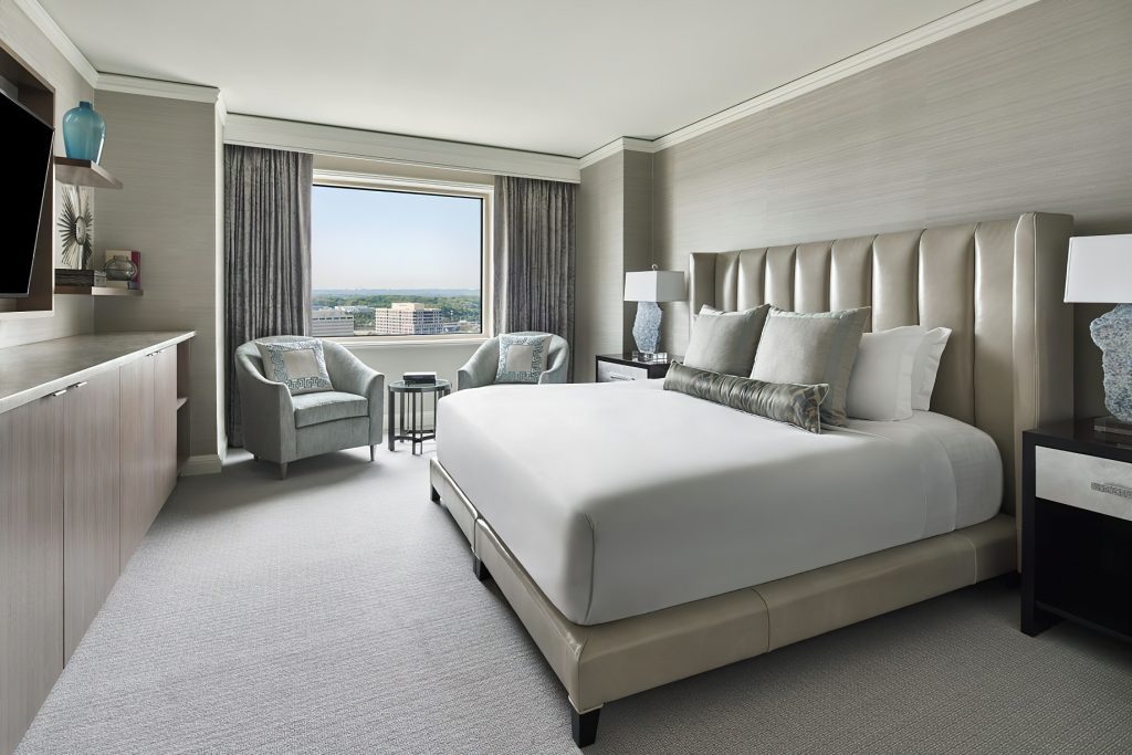 The hotels 398 rooms and suites blend style influences from Europe’s most beautiful cities with elements tied to northern Virginia. Inspired by a desire to blend comfort and elegance with fashion and couture, the interior design mixes the traditional foundation of the luxury hotel with more transitional spaces that feel modern and fresh. Intuitive technology and a cool color palette reflect the modern traveler in mind so individuals can work more easily and comfortably. The exclusive club lounge level embodies the feel of a stylish, rich library with open spaces to take advantage of the beautiful D.C. skyline views.