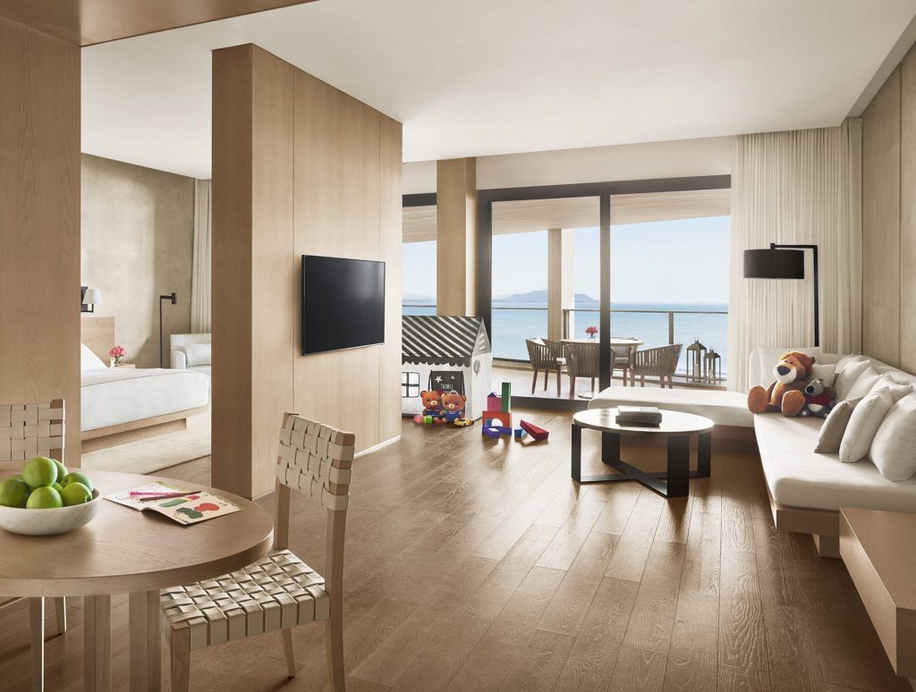 Each of the 501 guest rooms in the horseshoe-shaped hotel has ocean views. The interiors were designed to exude comfort, warmth, and sophisticated luxury. Interiors include light oak finishes and airy fabrics that evoke the beach, limestone floors from Indonesia, and a clean, light color palate. Bathtubs are positioned in the main room, surrounded by views, the space becomes even more luxurious and open.