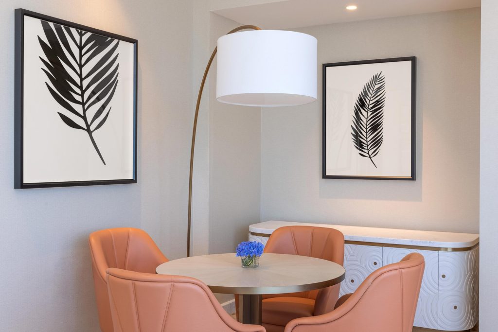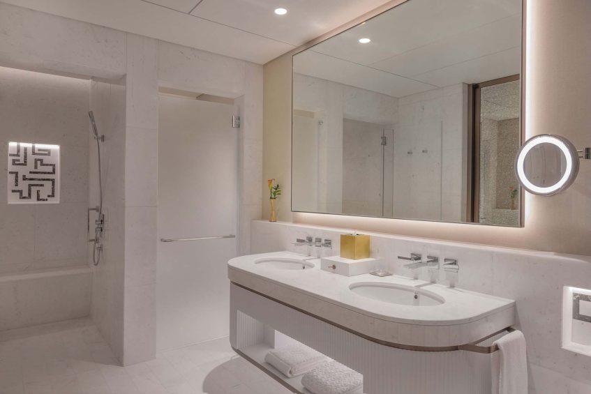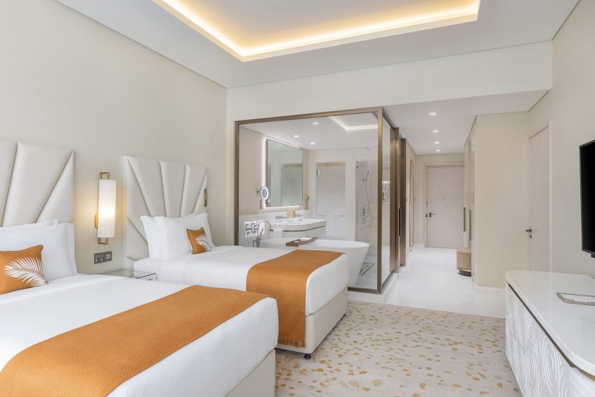 The suave and sophisticated rooms boast ample floor to ceiling windows with an abundance of natural light and many even include an open concept bathroom layout that takes in the magnificent views of The Palm and lofty vistas of the city. Guests can relax at the hotel’s two infinity pools, workout in The Exercise Room or unwind at the exquisite Iridium Spa.