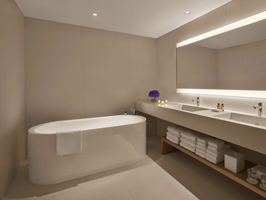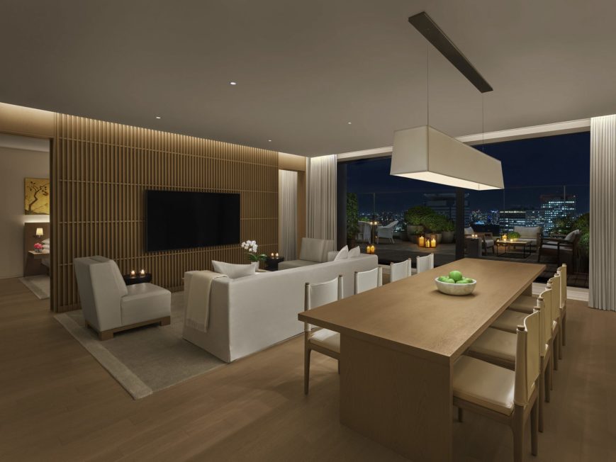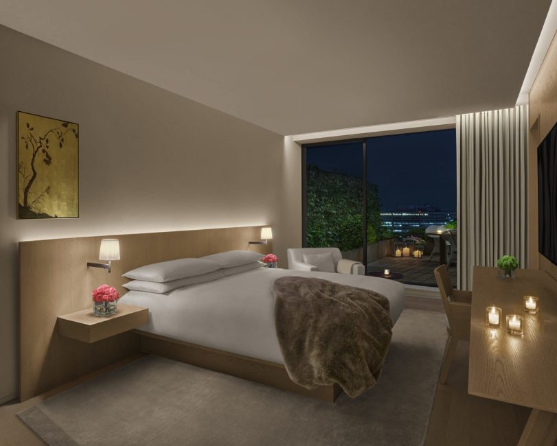 Designed by Kengo Kuma, the 206 elegant rooms at the skyscraper hotel feature stylishly modern decor and posh detailing. With the cities first-of-its-kind accommodation some of the luxurious units offer expansive outdoor terraces with landmark views. The result is an interior design with a soothing, tranquil environment that encapsulates both tradition and minimalism.